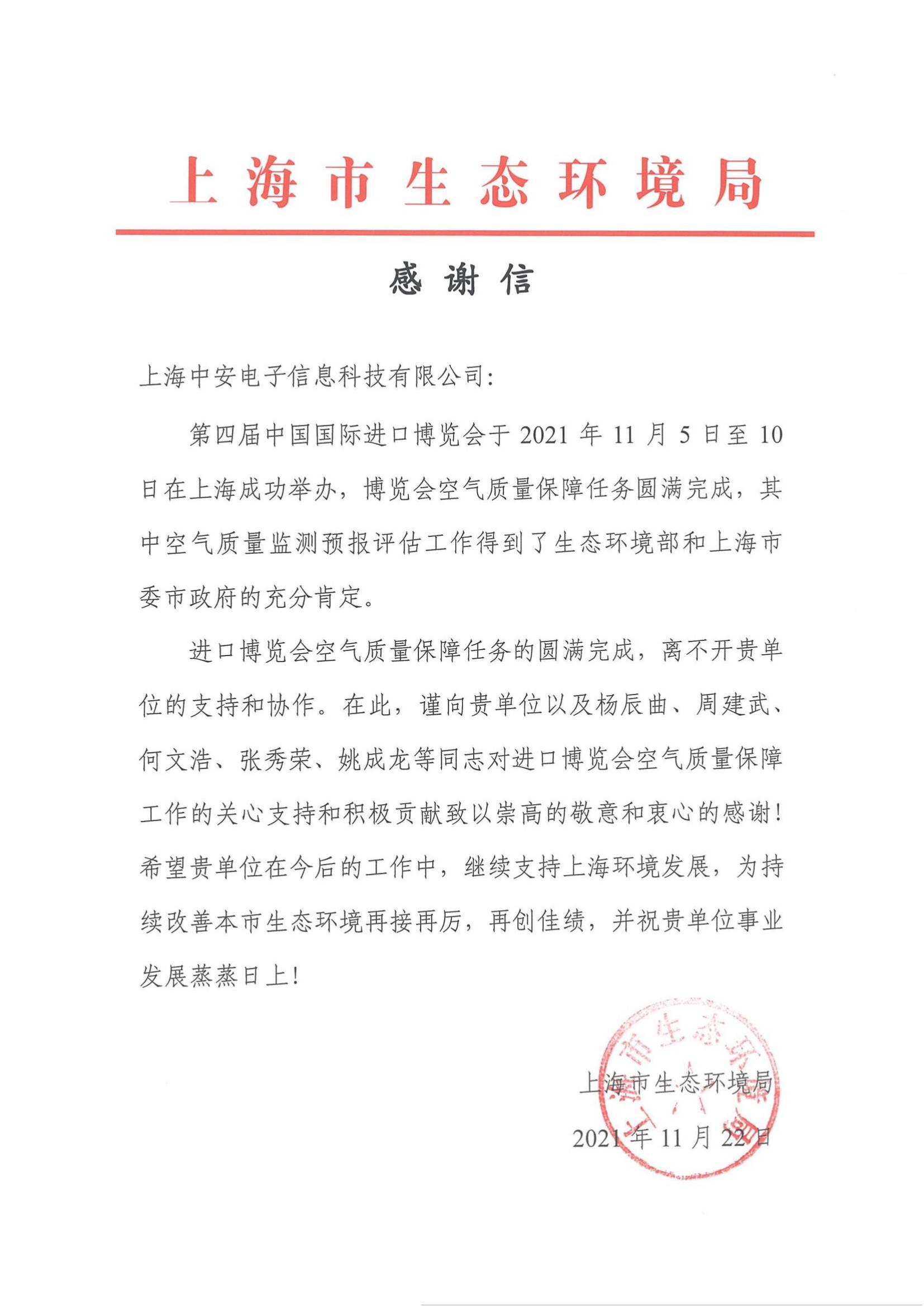 上海環(huán)監(jiān)中心就中安科技在21年國際進博會空氣質量監(jiān)測預報工作中杰出貢獻送來感謝信!(2021/12/31)